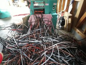 3.剥線機にかけて被覆のプラと銅線を分離します。